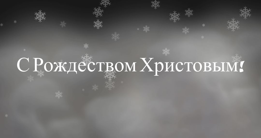 Festive typography laying over enchanting pattern of snowflakes drifting on a mystic gray cloudy backdrop. Evokes serene, wintertime holiday spirit. Perfect for Christmas greetings, festive digital cards, Russian Christmas promotional material.