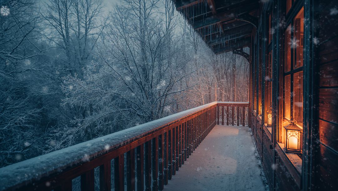 - Rustic Cabin Balcony in Serene Winter Landscape with Glowing Lanterns