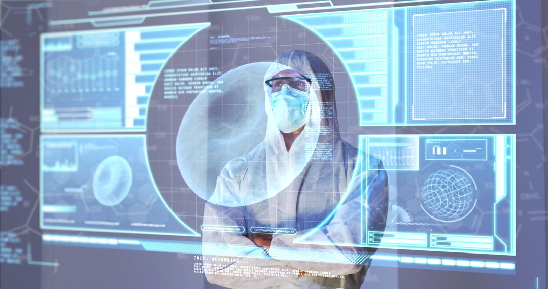 Scientist wearing protective gear standing with arms crossed, immersed in a digital interface displaying various high-tech analytical data. Ideal for use in themes related to cutting-edge technology, scientific research, futuristic medicine, and innovation in the laboratory sector.