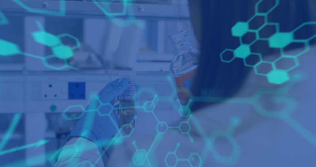 Laboratory professional in midst of research with digital graphics representing molecular data implying state-of-the-art experiments. Ideal for educational materials, scientific publications, biotech innovations discussion, or innovation-focused content.