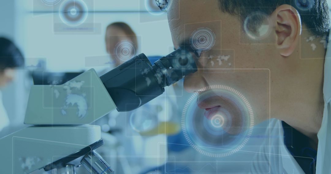 A male scientist closely examining through a microscope with digital data elements overlayed, symbolizing cutting-edge technological integration in research. Useful for showcasing advancements in scientific research, biotechnology, and innovation. Ideal for illustrating concepts in data science, global connectivity, and futuristic technological applications.