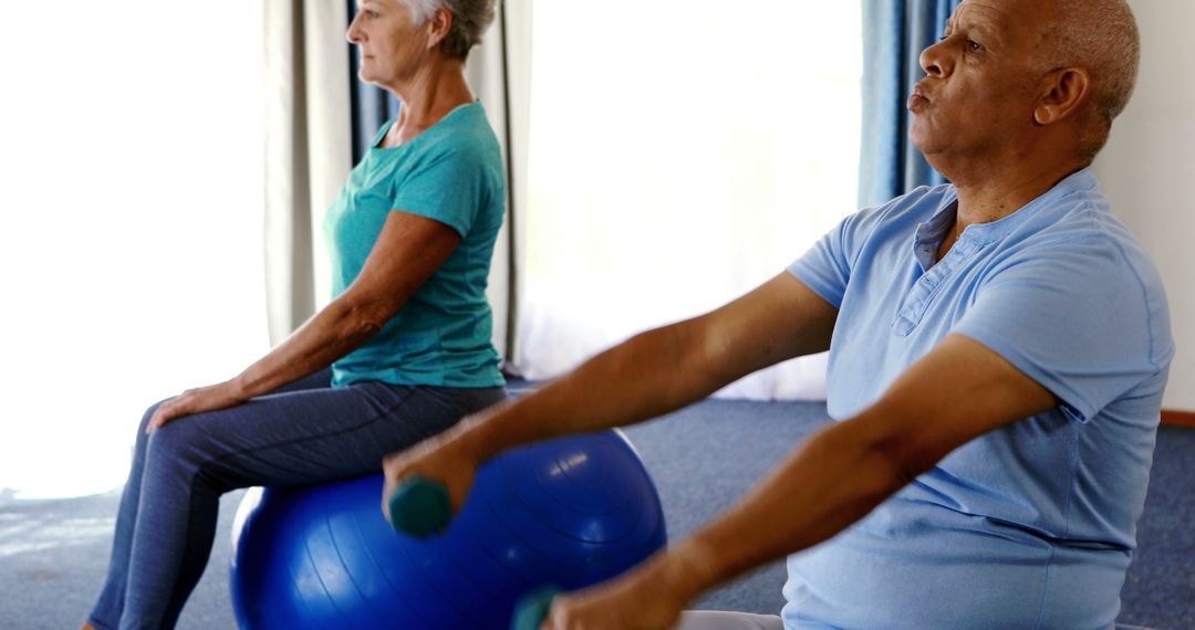 Two senior citizens are engaging in a fitness routine at home, focusing on weight training with dumbbells. A woman sits on a stability ball, while a man exercises purposefully, emphasizing the importance of regular physical activity for older adults. This image is well-suited for promoting healthy living, active aging, and fitness programs tailored for seniors.