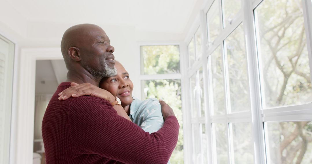 Senior couple enjoys tender moment while embracing and looking out a bright window, symbolizing love and togetherness in retirement. Ideal for articles and advertisements about senior living, wellness, retirement planning, and happy relationships in later years.