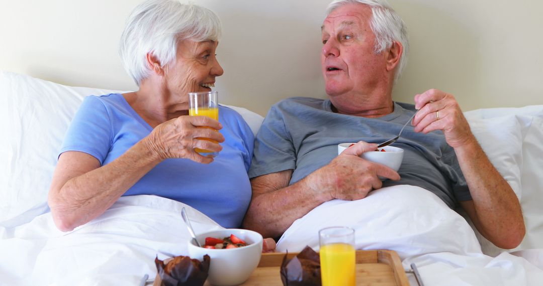 - Senior Couple Enjoying Breakfast in Bed with Joyful Conversation