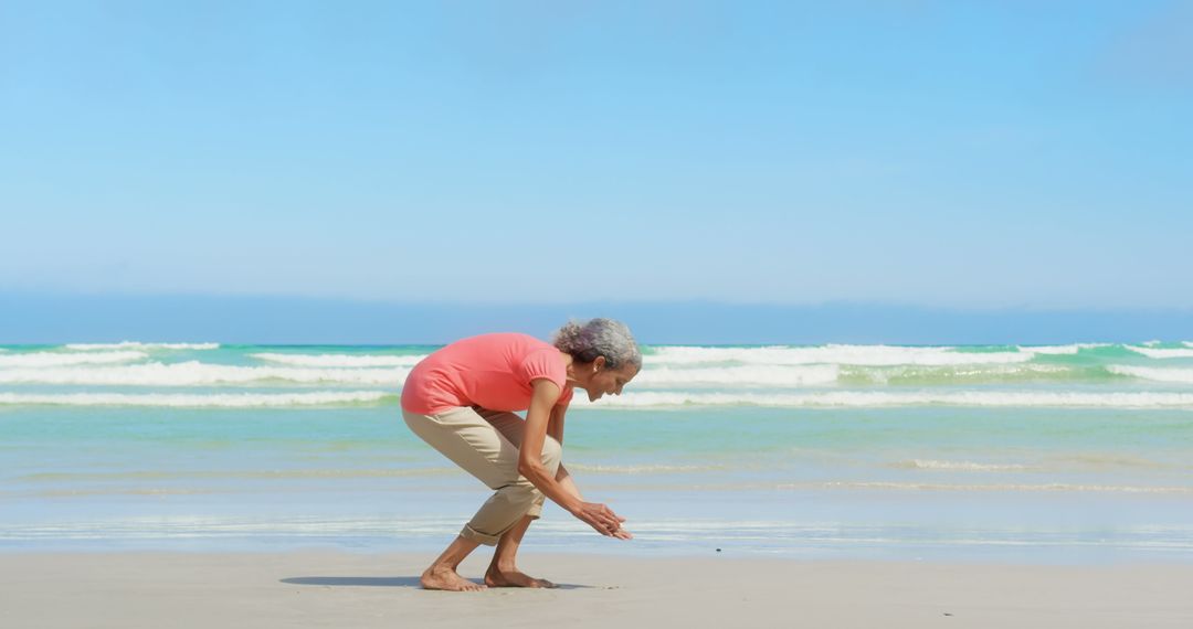 Scene captures a senior woman enjoying a serene beach day, picking up a seashell by the shoreline. Ideal for promoting active lifestyles, retirement activities, and relaxation concepts.