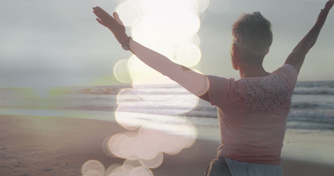 Elderly woman standing on serene beach with arms wide open, basking in natural light and seaside vibes. Great for themes related to retirement, self-discovery, relaxation, freedom, summertime leisure, and celebrating life. Suitable for use in wellness advertising or inspirational content.