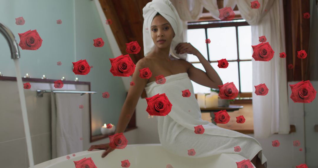 African American woman enjoying a spa experience in bathroom blending modern tranquility with a digital overlay of floating rose petals, enhancing a sense of luxury and self-care. Suitable for advertisements promoting bath products, home wellness environments, or illustrations in digital savvy lifestyles.