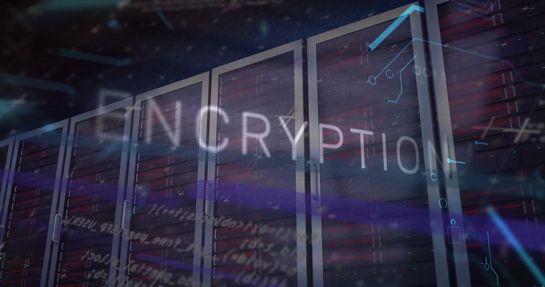 This visual emphasizes the significance of data protection, presenting a network server room with superimposed text about encryption. Ideal for articles and presentations on cybersecurity, digital transformation, or IT infrastructure, it communicates themes of modern technology and information security management.