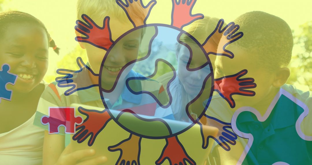 This image features a group of smiling children set outdoors behind a globe encircled by colorful hands and puzzle pieces, representing autism awareness, support, and inclusivity. Ideal for use in educational materials, awareness campaigns, social media posts related to diversity in learning and support for children with learning difficulties.