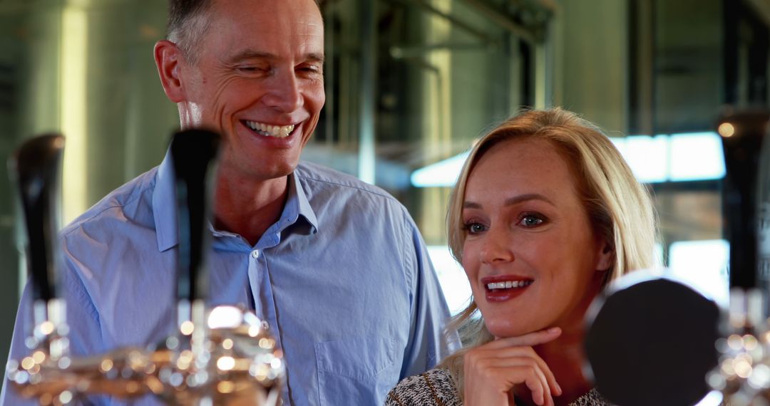 Couple is sharing a moment of happiness, suggesting engaging experience. Ideal for illustrating topics related to happiness, exploration, retail spaces, or chemistry between people in personal or professional environments. Useful in advertisements or stories depicting positive human interactions and shared moments.