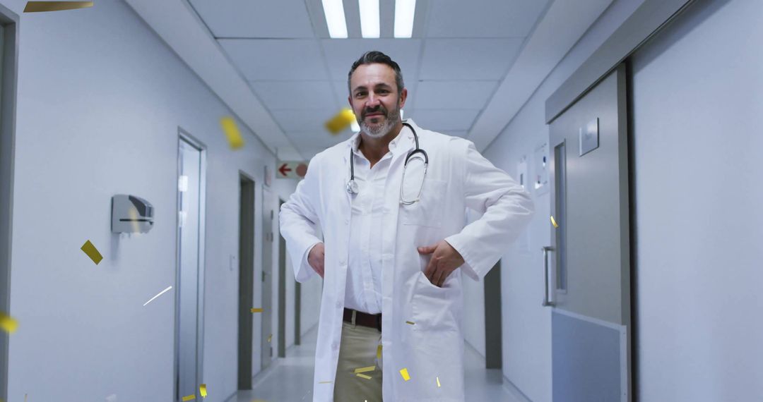 Middle-aged male doctor in a hospital corridor, wearing a white coat and stethoscope, surrounded by floating confetti. Suitable for concepts related to medical achievements, celebrating healthcare workers, or promoting wellness and positivity in medical settings. Useful for medical advertising, health campaigns, and hospital promotions.