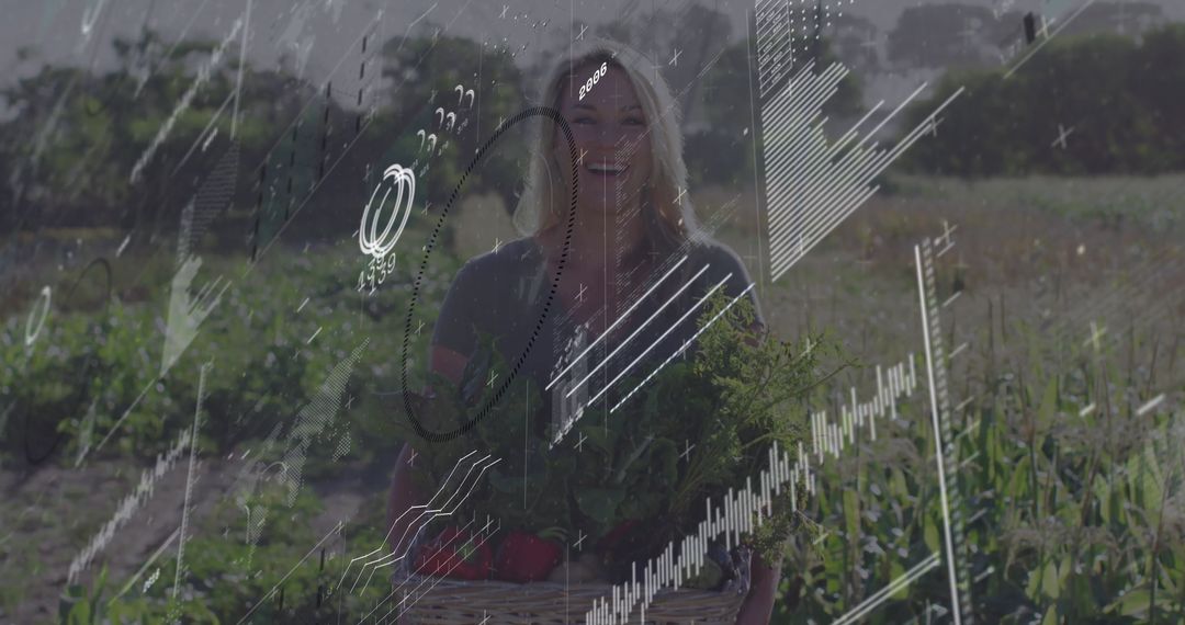 - Smiling Farmer with Basket of Vegetables and Data Overlay
