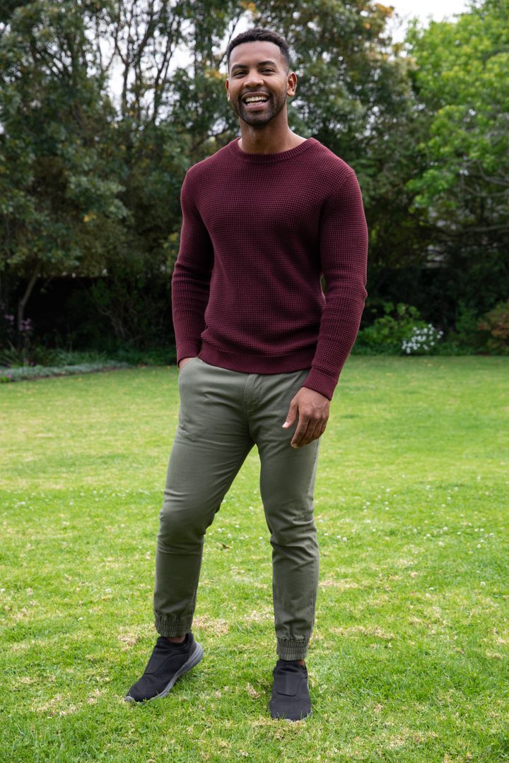 Young African American man stands confidently on well-kept lawn, surrounded by lush greenery. Dressed in comfortable maroon sweater, olive joggers, and black slip-on shoes, person embodies casual, laid-back lifestyle. Ideal for use in fashion, outdoor leisure, or wellness-related materials.