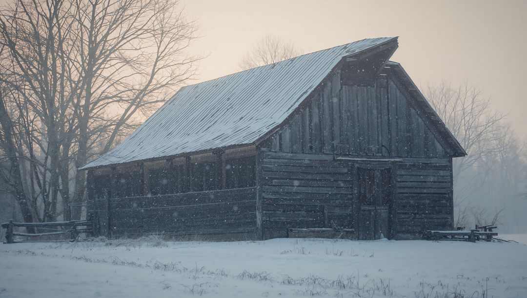 - Snow-covered Rustic Barn at Dusk in Foggy Meadow with Corrugated Roof and Bare Trees