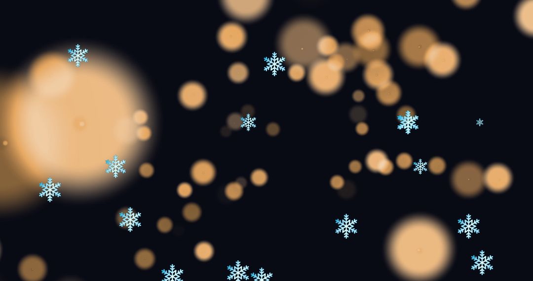 Snowflakes descend through a glimmering field of bokeh lights against a dark backdrop. This composition captures a blend of winter beauty and festive ambiance. Perfect for holiday season promotions, Christmas card backgrounds, or social media posts celebrating the winter festivities. The interplay of cool snowflakes and warm orange lights creates a contrasting and visually engaging scene for seasonal marketing and greetings.