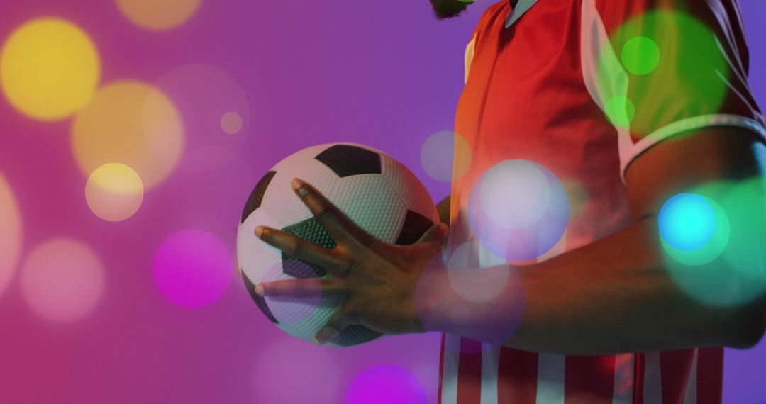 Soccer Player Holding Ball with Colorful Spotlights Image