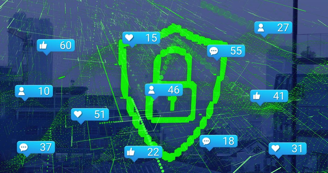 Illustrates rising social media engagement shown by increasing numbers on icons, alongside digitally generated padlock representing data security over a modern cityscape. Ideal for marketing materials about data security in the age of amplified digital communication, technology and privacy protection, online marketing strategies, internet connectivity. Useful for articles on tech innovations or promoting cybersecurity measures in social networking platforms.