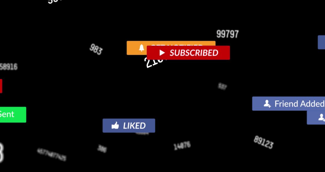 Abstract digital theme of social media icons including likes, follows, and subscriptions against a black background conveys engagement and connectivity. Ideal for illustrating concepts of digital communication, growth in online presence, influencer marketing strategies, or technology news.