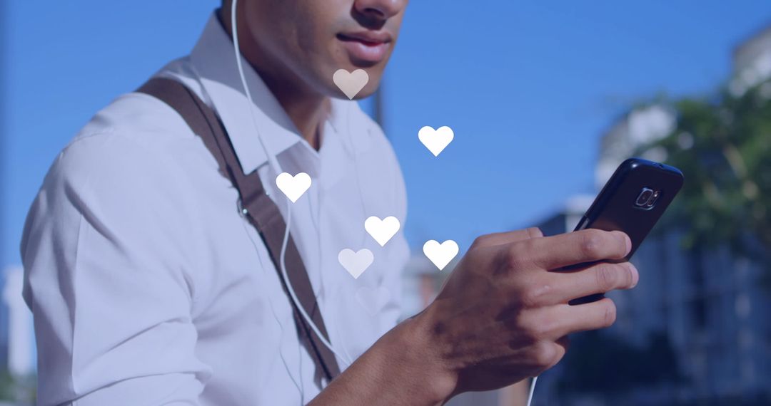 Image depicts a young adult using a smartphone outdoors, symbolizing engagement with social media platforms. Floating heart icons indicate interaction and communication online. Suitable for illustrating concepts related to digital technology, online communities, or mobile applications in marketing materials and social media campaigns.