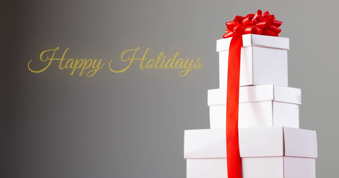 Vertical stack of white gift boxes tied with a striking red ribbon, with 'Happy Holidays' text stylized in elegant lettering against a plain grey backdrop. Ideal for a festive season greeting card, starring in holiday marketing materials, or serving as decorative imagery for Christmas promotions inspiring a sense of joy and generosity during the winter season.