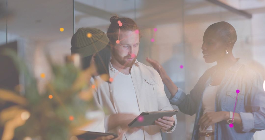 Startup Team Collaborating Over Tablet with Augmented Data Visualization Overlay Image