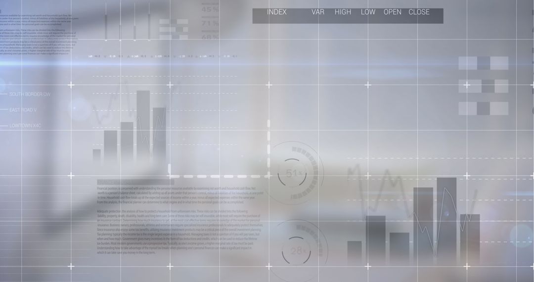 This image features an abstract digital interface displaying various data charts and analytics elements including bar graphs and indexing. It conveys themes of modern technology and financial analysis. Ideal for use in publications or presentations focusing on data analysis, financial trends, tech advancements, and business strategies.