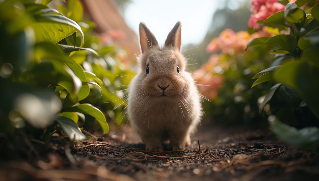 AI Generated Image. Light-brown rabbit standing on garden dirt path, backlit by warm sunlight, fur glowing against soft bokeh of pink flowers and lush green leaves. Closeup low-angle perspective emphasizing whiskers, round eyes, tiny paws and delicate textures. Composition fitting horizontal layouts and social media banners, with shallow depth of field creating dreamy background. Usage suggestions: Enhancing greeting cards, decorating nursery prints, illustrating spring or Easter articles, supporting pet care and animal welfare campaigns, enriching lifestyle blogs and social feeds. Works well for product packaging, seasonal promotions, editorial spreads and mood boards focusing on warmth, innocence and nature. Color palette featuring warm golden tones, soft pastels and fresh greens. Licensing note: AI-generated content tag included for transparency.