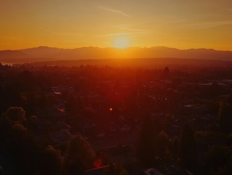 - Sunset Over Urban Landscape with Mountain Silhouette