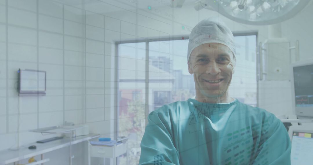 Caucasian male surgeon smiling while overlays of digital data suggest advanced technology integration in a modern hospital setting. Ideal for illustrating themes of innovative healthcare, future of medicine, and professional medical care. Can be used for educational materials, healthcare presentations, or technology-driven medical marketing.