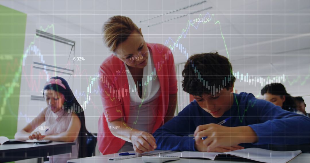 Visual portrays a teacher helping students in classroom setting, with digital financial graphs superimposed, emphasizing integration of traditional education and modern data technology. Useful for articles, advertisements, and materials focusing on innovative teaching methods and educational technology.
