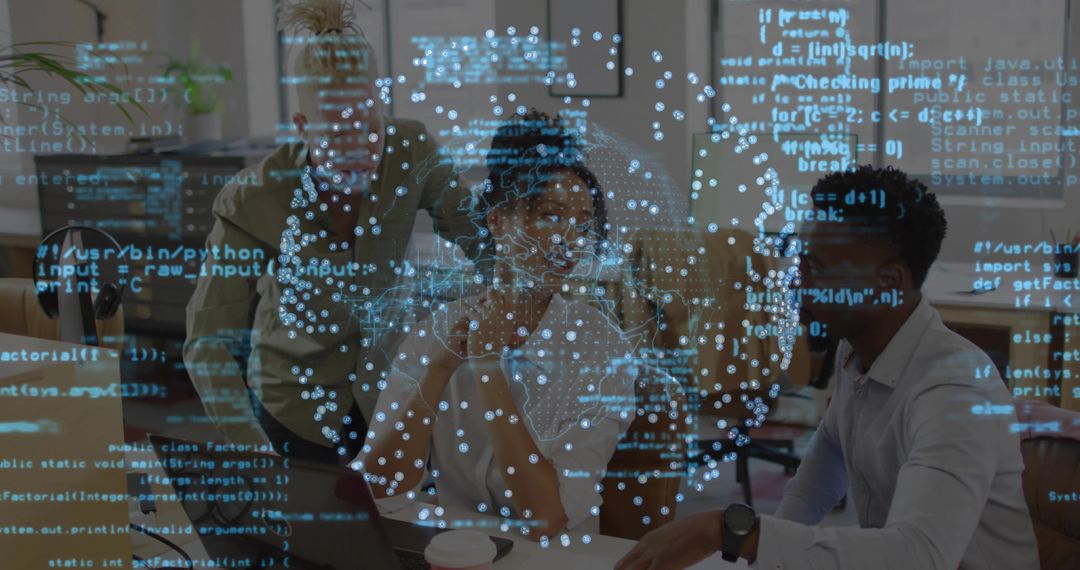 Team Collaborating and Analyzing Global Data Visualization with Code Overlay Image