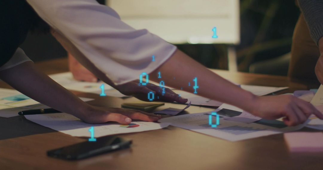 Showing close-up of hands arranging charts and documents on table with glowing binary overlay, conveying collaborative data analysis and strategic planning. Suiting marketing materials for analytics firms, fintech campaigns, corporate strategy decks, startup pitches, business intelligence reports, and teamwork articles. Providing strong visual for website header, blog illustration, social media post, annual report, presentation slide, and webinar thumbnail. Allowing crop for hero banner or zoom into charts and binary effect for background texture. Emphasizing teamwork, hands-on analysis, digital transformation, and decision-making under tight deadlines.