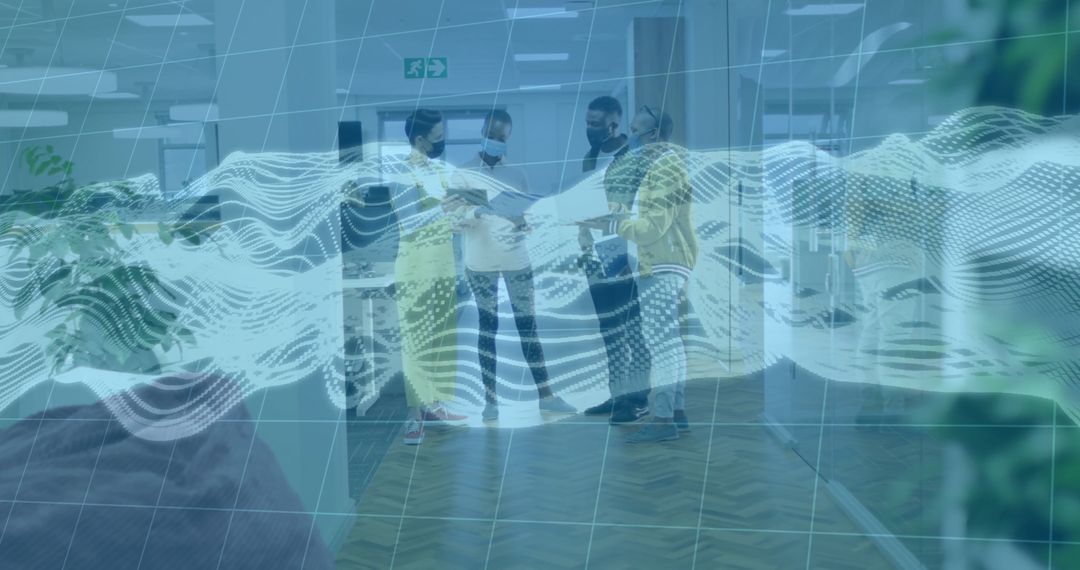 Image shows team of professionals standing together, wearing masks, reviewing file in bright office corridor. Modern technology with digital data overlay emphasizes tech-driven workspace. Ideal for illustrating concepts of professional collaboration, modern work environment, tech integration in corporate settings, and workplace safety protocols.