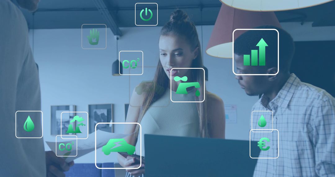 Three colleagues collaborating in modern office, using smartphone and laptop while interacting with augmented reality icons for sustainability metrics such as CO2, water consumption, energy usage, and growth trends. Composition highlighting teamwork, digital dashboard overlays, and technology-driven sustainability planning. Use for presenting corporate sustainability reports, illustrating digital transformation in marketing materials, enhancing startup pitch decks, supporting training modules for AR applications, showcasing energy management dashboards, and promoting environmental initiatives on social media. Crop for hero banner, website header, or presentation slide; leave space for headline and logo on upper left or right; apply color overlay for brand consistency and increase contrast for small thumbnails. Ideal for sustainability teams, product managers, UX designers, and startups communicating green technology benefits.