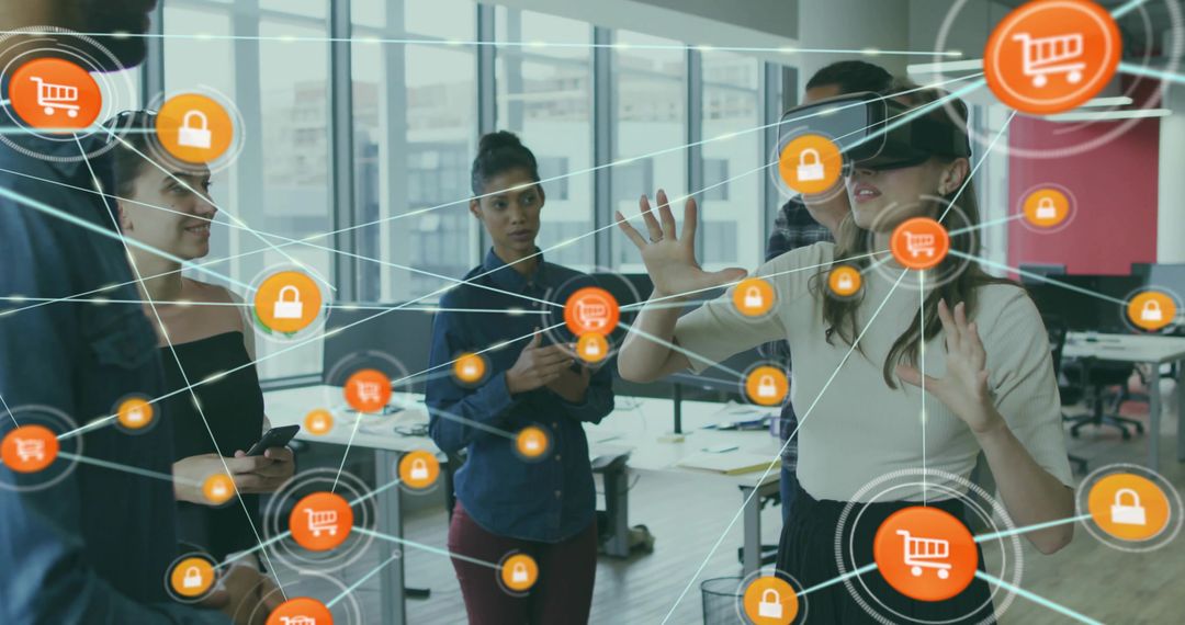 Scene showing team testing VR headset with interactive e-commerce icons and security lock overlays in modern open office. Visual blending of connecting lines and shopping cart icons suggesting networked retail, secure transactions, and user interaction via gesture control. Perfect for illustrating VR commerce demos, UX/UI presentations, startup pitch decks, cybersecurity in retail, and technology training materials. Using for website hero banners, digital marketing, editorial features on innovation, conference slides, and social media campaigns. Composition providing space for headline or branding on right side.