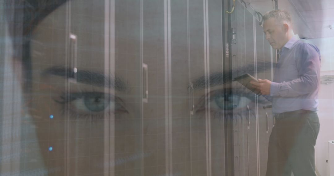 Man using a tablet in a server room suggests focus on data analysis and management, reflecting the integration of technology into IT processes. Overlay of vigilant eyes symbolizes cybersecurity and data privacy. Useful for illustrating concepts in technology, network security, digital innovation, and IT management strategies.