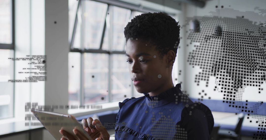 Image captures tech-savvy woman interacting with tablet in modern office setting, with virtual coding overlay and world map design. Perfect for illustrating topics related to digital transformation, professional development, tech workspaces, and modern business solutions. Ideal for technology advertising, business training materials, and innovation blogs.