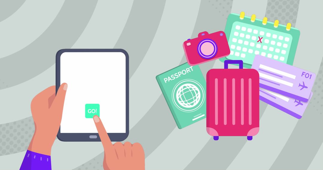 Illustration showing hands using a tablet alongside various travel icons such as a passport, suitcase, camera, boarding tickets, and a calendar. Ideal for concepts related to planning vacations and digital travel services. It can be used in blog posts, travel agency websites, promotional materials for travel apps, or technology features focused on easing travel planning.