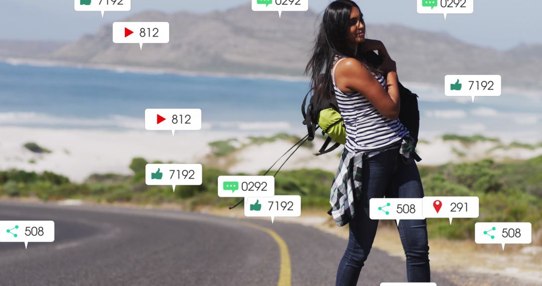 Young woman on scenic roadway interacts with digital world as social media notifications surround. Ideal for illustrating social media influence, technology in travel, or dynamic digital engagement.