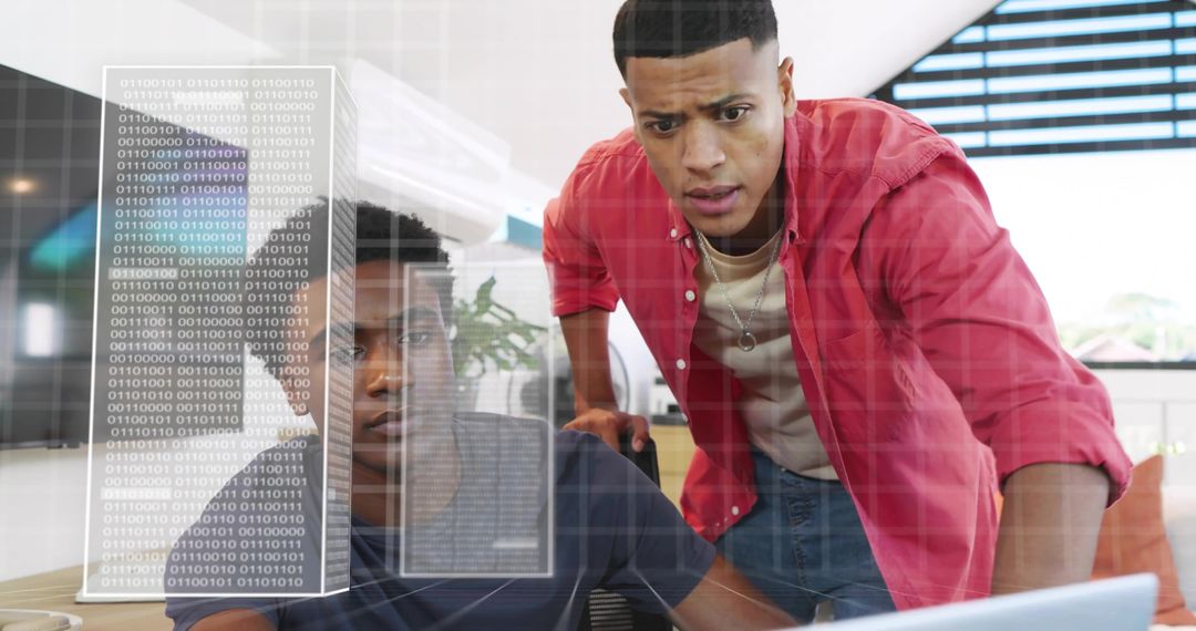 Scene showing two men collaborating over laptop with binary code overlay, conveying focused concentration and urgent problem solving. Composition displaying natural daylight, modern office interior, casual workwear, and digital data visualization overlay. Useful for website hero banners, blog posts about software development, cybersecurity, or teamwork; training materials for coding bootcamps; startup pitch decks; recruitment campaigns for IT roles; corporate presentations about data analytics and UX design. Visual working well in editorial usage for articles on remote collaboration, pair programming, code review, and rapid troubleshooting.