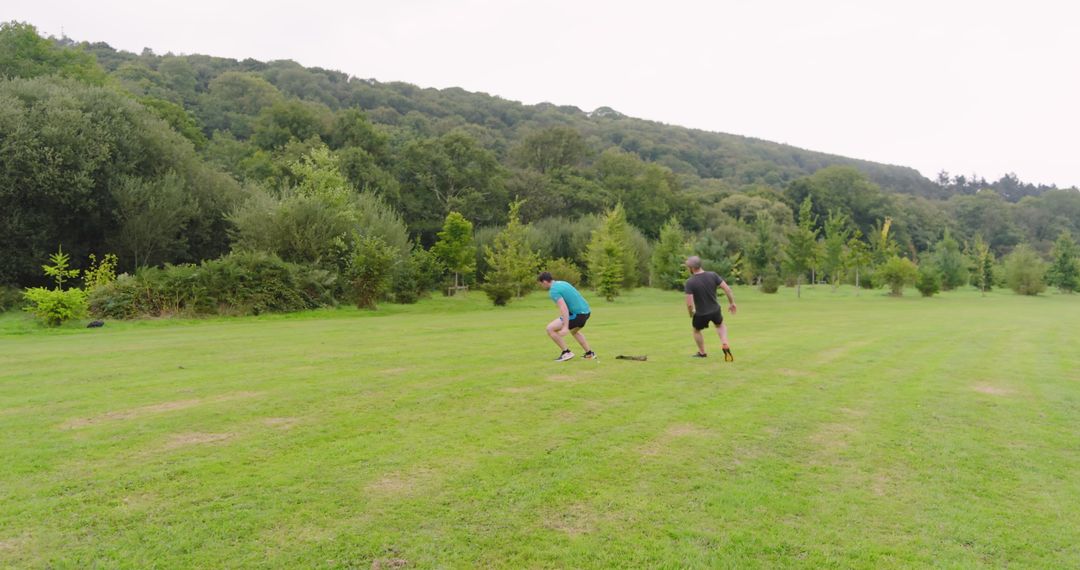 This scene depicts two men engaged in jogging within a vast, green park surrounded by Nature's bounty. Ideal for themes related to healthy lifestyles, fitness routines, and cardio exercises. It can be used in campaigns or articles promoting outdoor activities, mental health benefits of exercising in Nature, or awareness about the importance of preserving green spaces.