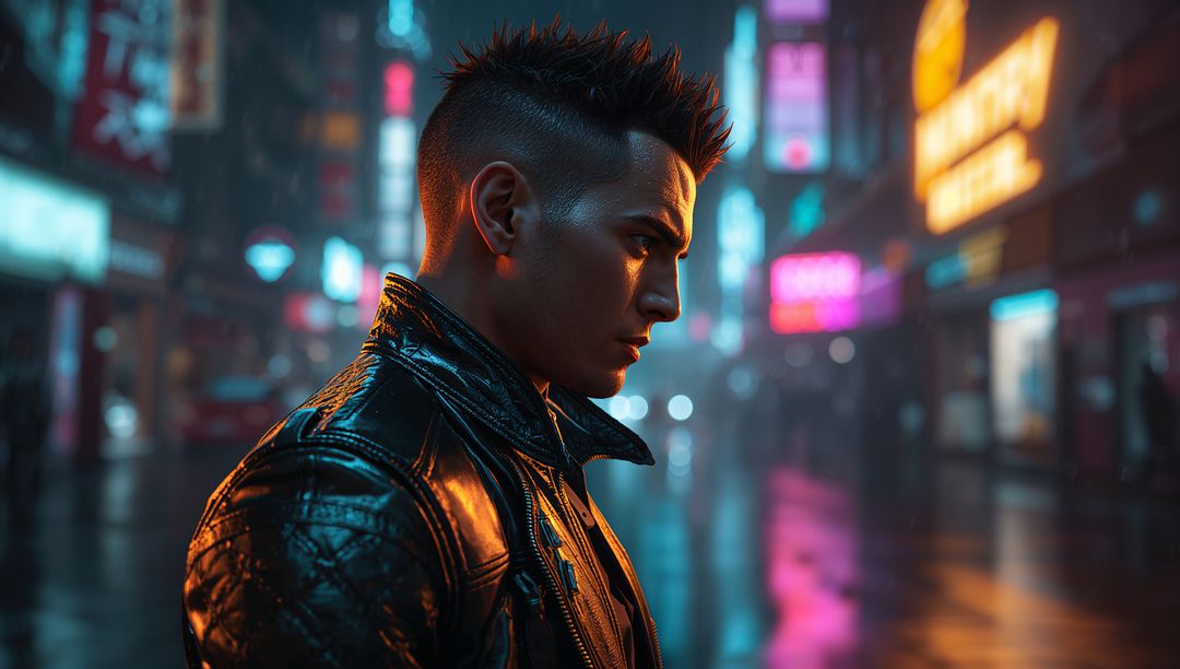 - Urban Night Street Scene with Man in Leather Jacket and Neon Signs