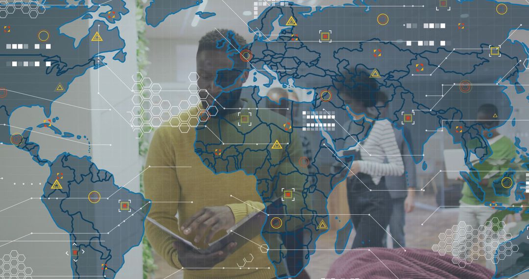 Mid adult man holding tablet and using global data visualization overlay in open-plan office with colleagues in background. Perfect for illustrating digital transformation, business analytics, remote collaboration, UX interface concepts, and network operations. Use as website hero, presentation header, blog feature, corporate report, marketing campaign, or training material. Crop to focus on tablet and overlay for hero banner. Apply color grade to match brand palette and increase contrast for overlay clarity. Add headline and call-to-action in empty space right side. Consider desaturating background and boosting foreground sharpness to emphasize data overlay. Licensing suitable for commercial and editorial use across digital and print.