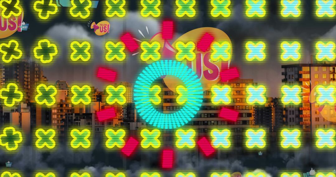 Dynamic visual representation with colorful digital elements over an urban skyline, reflecting modern communication themes. Ideal for tech and social media presentations, marketing materials, and introductory scenes in digital platforms.