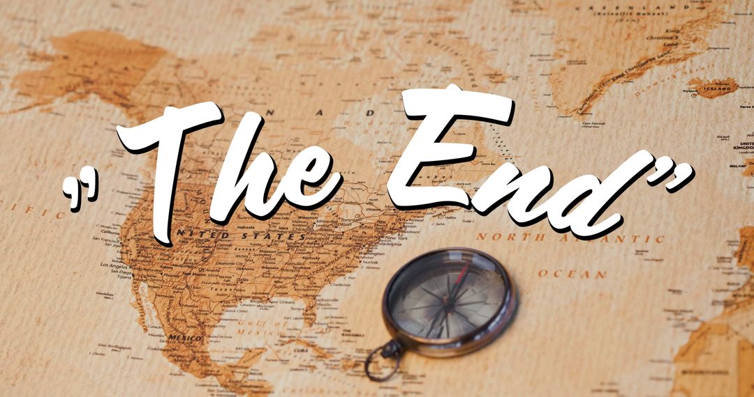 Visual featuring a vintage-style world map with a classic black compass and an overarching 'The End' typography in white. Represents themes of exploration and conclusion, perfect for travel inspiration, journey conclusion discussions, motivational designs, or as an accent in navigation-themed projects.