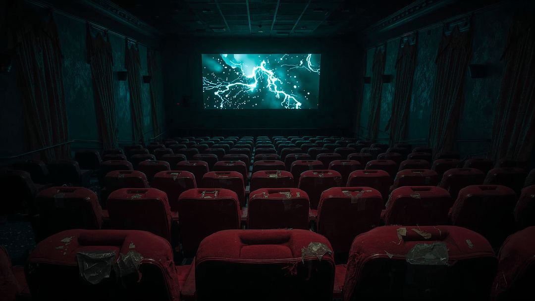 AI Generated Image. This evocative depiction of an empty vintage cinema features rows of classic red seats accented with peeling tape, creating a strong retro vibe. The teal-toned lightning displayed on the large screen enhances the dramatic atmosphere, contributing to a sense of decay and nostalgia. Ideal for storytelling about classic movie-going experiences, historical narratives of theater evolution, or creative backgrounds seeking inspiration throughout the ages.