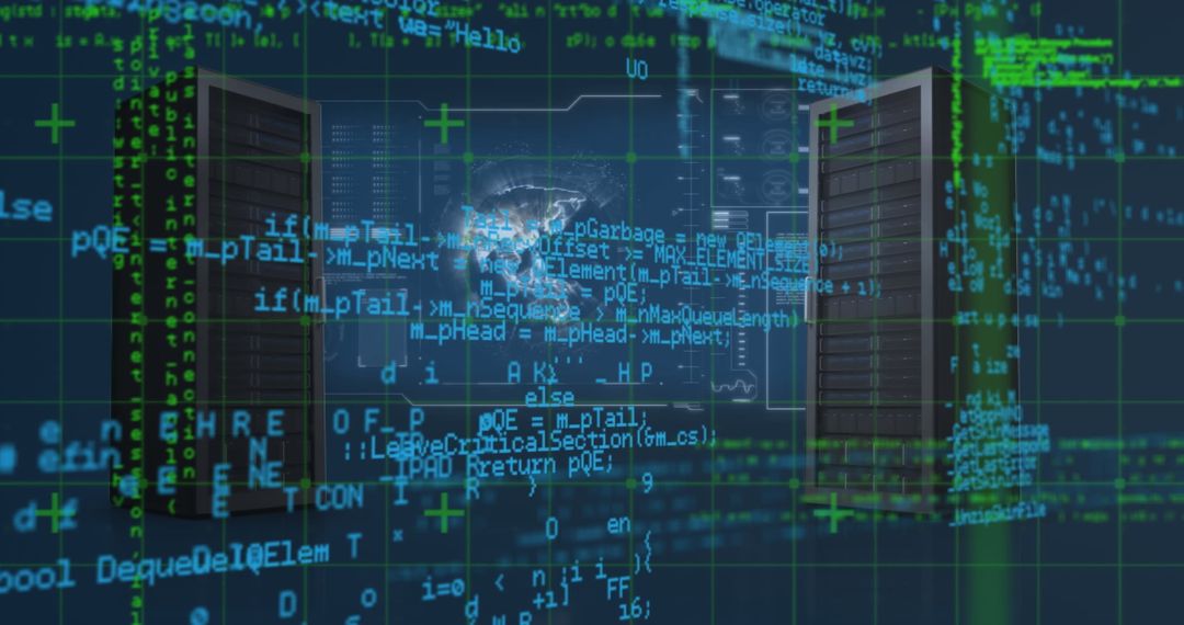 Scene displays server racks in a digital landscape, suggesting a high-tech data management environment. Suitable for media or content discussing topics such as cybersecurity, data centers, and advanced technology deployments. Ideal for illustrating network architecture, digital futures, or the virtualization of servers.