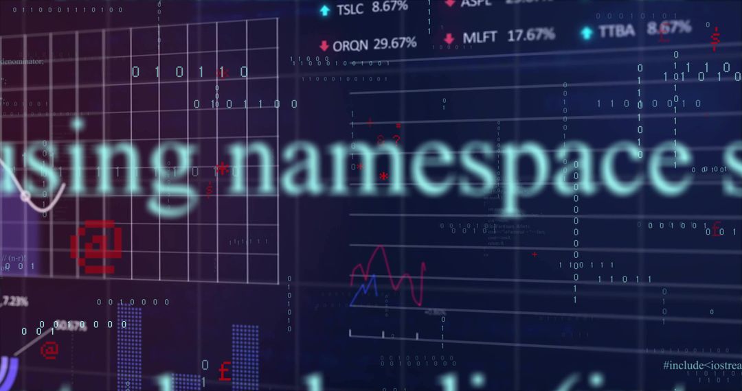 This illustration captures the synthesis of technology and analytics with a focus on coding environments. Blurred central text represents dynamic programming elements within a virtual interface, accompanied by digital charts, data points, and stock tickers. Suitable for articles or designs related to technology innovation, software programming tutorials, or futuristic IT themes.