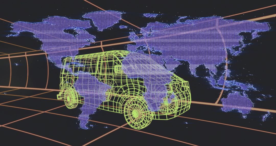 Featuring neon-green wireframe van projecting purple world map nodes across orange grid. Conveying concepts: autonomous vehicle simulation, fleet tracking, geospatial analytics, digital twin visualization, network connectivity. Working well for website hero banners, pitch decks, whitepapers, product pages, trade show graphics, social media ads. Pairing with bold typography, high-contrast color palettes, layered data overlays for modern tech branding. Enabling cropping for landscape and banner formats, adding motion graphics for video intros, using as hero background for mapping or mobility solutions.