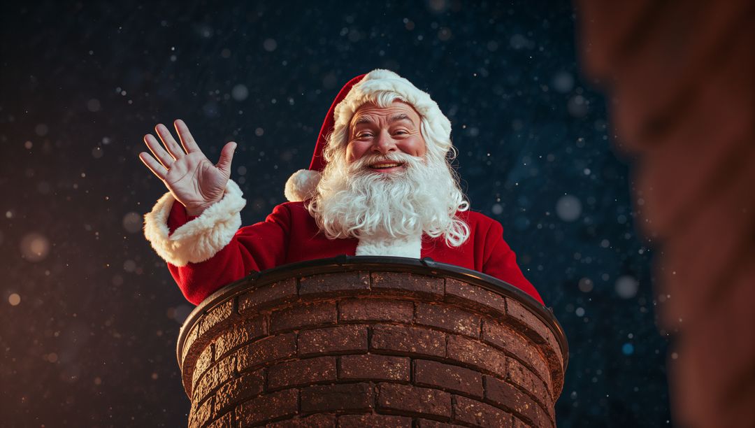 - Waving Santa Claus in Chimney with Falling Snowflakes During Festive Holiday